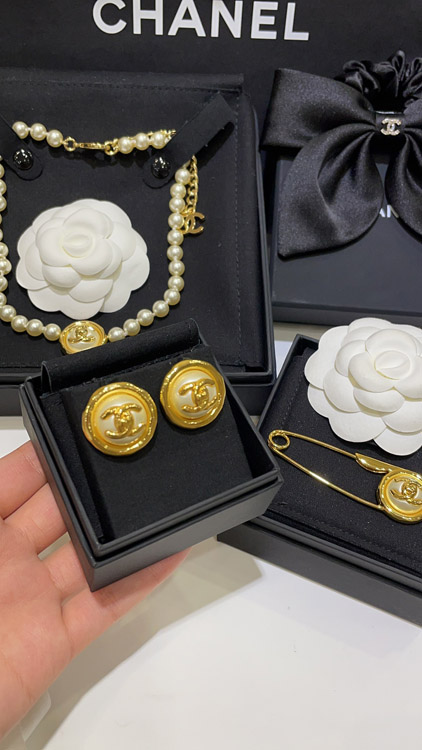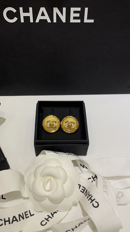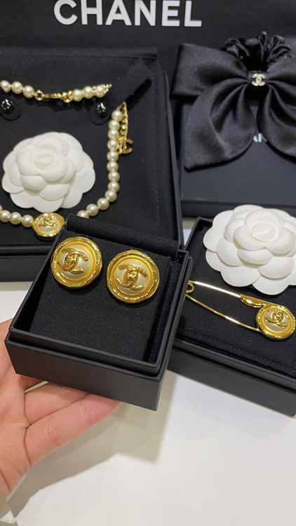 Celine pearl round button gold backpack buckle double C earrings-3899