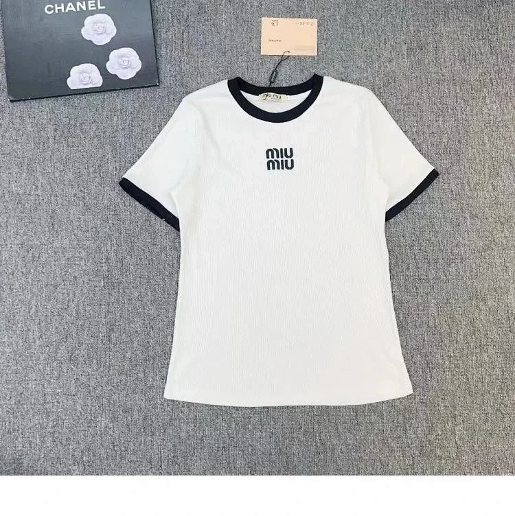 MIUMIU 2025 New Round Neck Contrast Color Letter Print Loose Short Sleeve T-shirt-2583